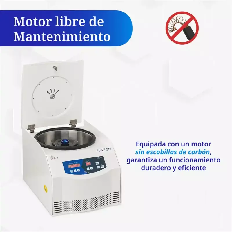 Permite configurar la velocidad en RPM o en FCR (xg), lo que facilita seleccionar el parámetro correcto según tu protocolo. Integra motor sin escobillas (libre de mantenimiento), pantalla LED de 7 segmentos para controlar velocidad y tiempo, y 10 niveles programables de aceleración y frenado (0 a 9) para ajustar el arranque y la desaceleración según el tipo de muestra. Para operación y seguridad, incorpora cerradura electrónica con apertura automática de tapa, protección contra desbalanceo y alarma sonora al finalizar el ciclo.