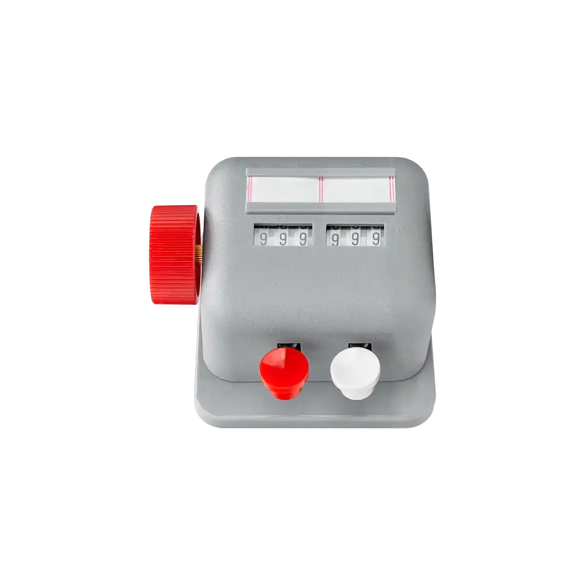 Funciona sin baterías, ofrece timbre cada 100 recuentos para reducir errores y permite reset inmediato a “000” mediante perilla lateral. Carcasa de ABS, engranes resistentes y base con 4 gomas antideslizantes para uso continuo en laboratorio.