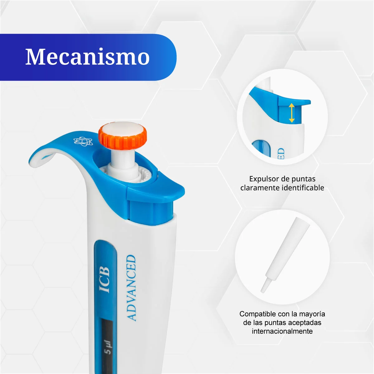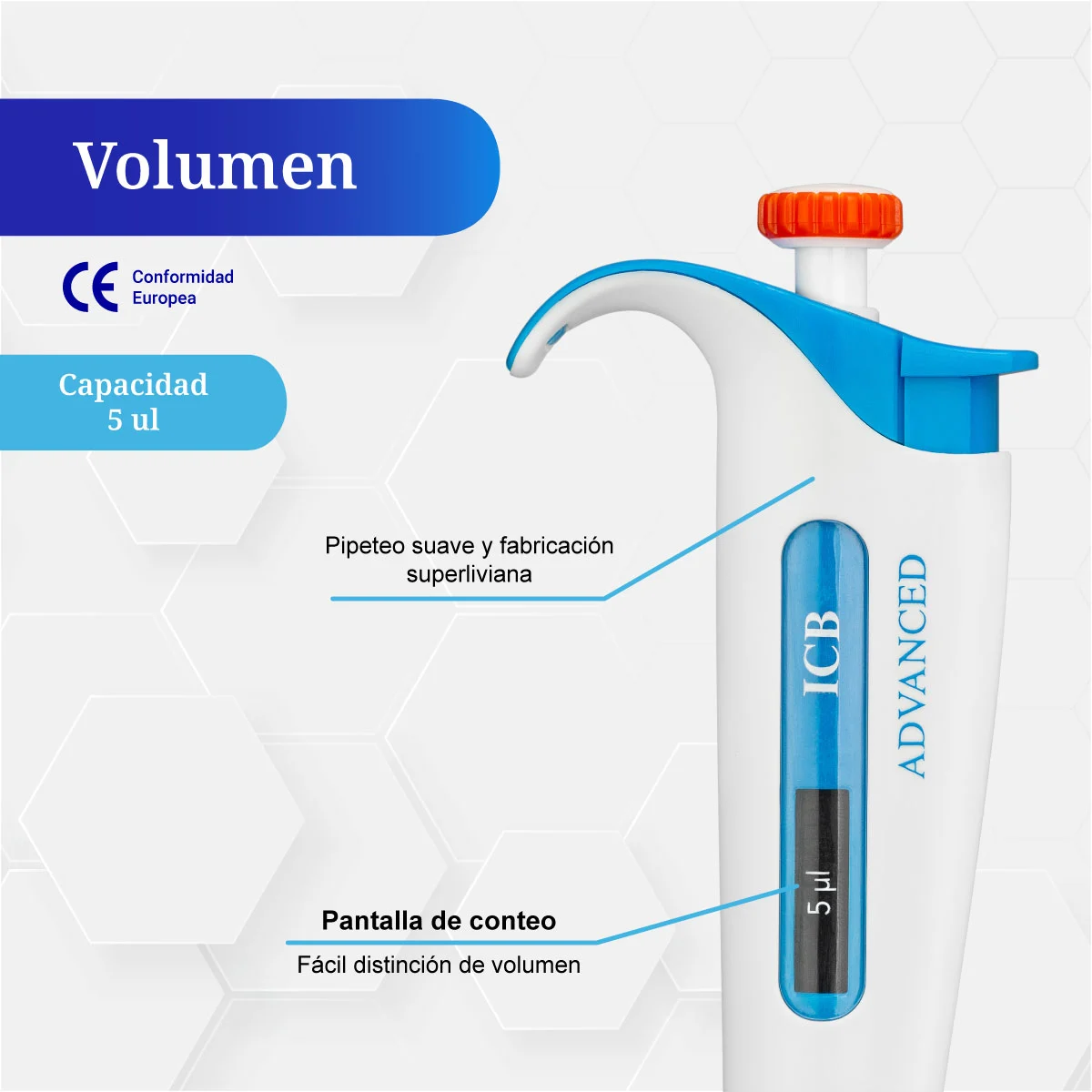 Micropipeta Advanced 5 µl precisión y comodidad en el laboratorio. Diseñada con tecnología avanzada µAir™ y UniCal™, garantiza resultados consistentes y confiables al minimizar la compresión de aire y facilitar una calibración eficiente. Su mecanismo ergonómico ofrece un movimiento del émbolo suave y ligero, junto con un eyector de puntas integrado para un manejo sencillo. Compatible con puntas universales, esta micropipeta es la solución ideal para tareas que requieren exactitud en entornos prácticos y exigentes.