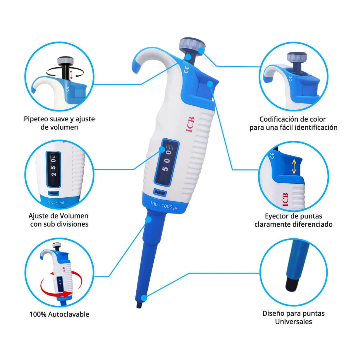 Micropipeta de Volumen Variable 100-1000ul marca ICB de alta precisión y versatilidad que permite la medición y transferencia de líquidos en volúmenes que van desde 100 hasta 1000 microlitros. Diseñada con la más avanzada tecnología, esta micropipeta es imprescindible en entornos científicos y de investigación, así como en aplicaciones clínicas y biomédicas.