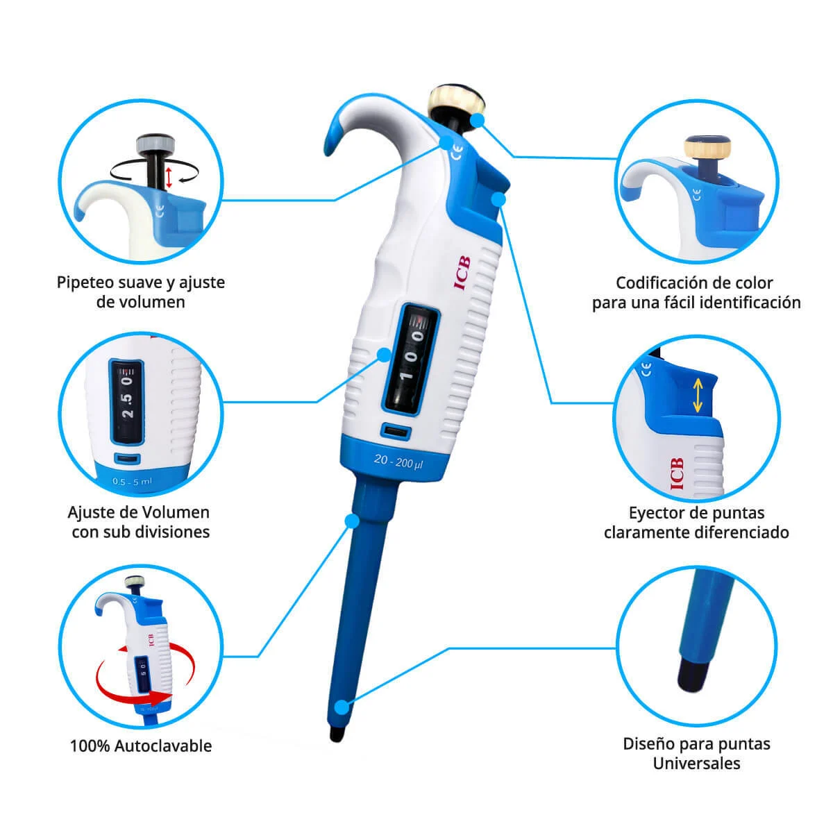 Micropipeta de volumen variable de 20-200ul marca ICB con su capacidad de volumen variable, esta micropipeta te brinda la flexibilidad necesaria para adaptarte a diferentes volúmenes de muestra y necesidades experimentales.