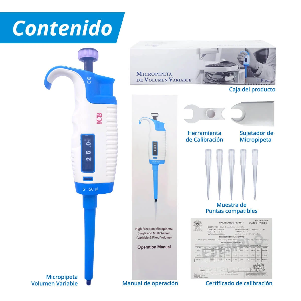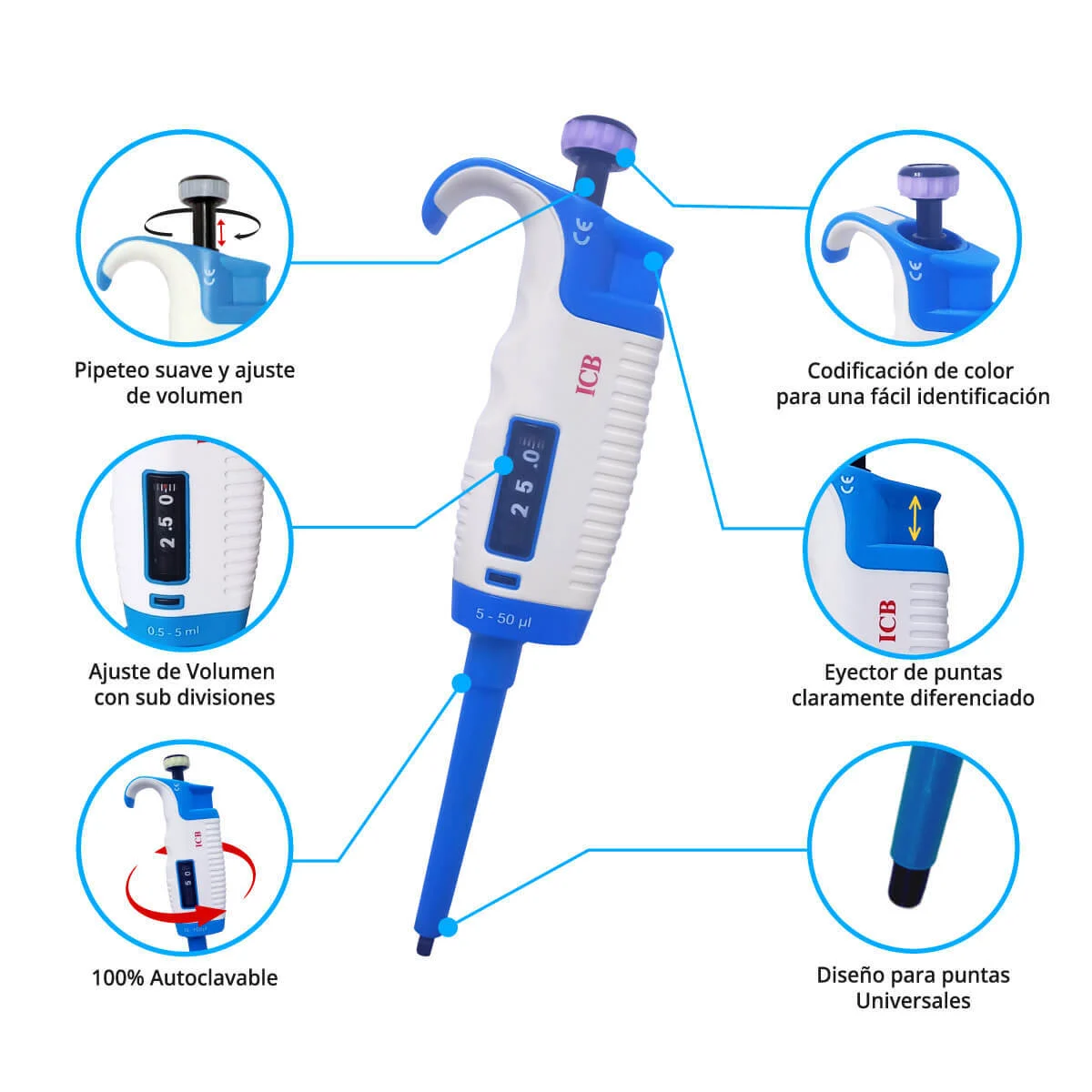 La micropipeta de volumen variable de 5-50ul Marca ICB esencial en el laboratorio para la medición precisa y la transferencia de líquidos. Esta micropipeta te ofrece la flexibilidad de ajustar el volumen según tus necesidades específicas, lo que la convierte en una opción ideal para una amplia gama de aplicaciones científicas y de investigación.