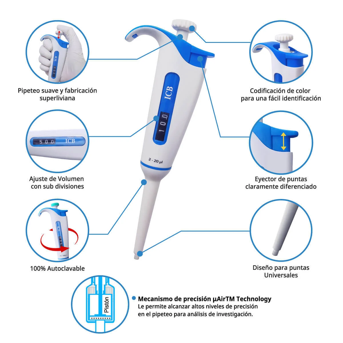 Micropipeta nero volumen variable de 2 – 20 ul Marca ICB esencial en laboratorio para la medición precisa y la transferencia de líquidos en el rango de microlitros. Con su capacidad de volumen variable, esta micropipeta ofrece una solución versátil y confiable para una amplia gama de aplicaciones científicas y de investigación.