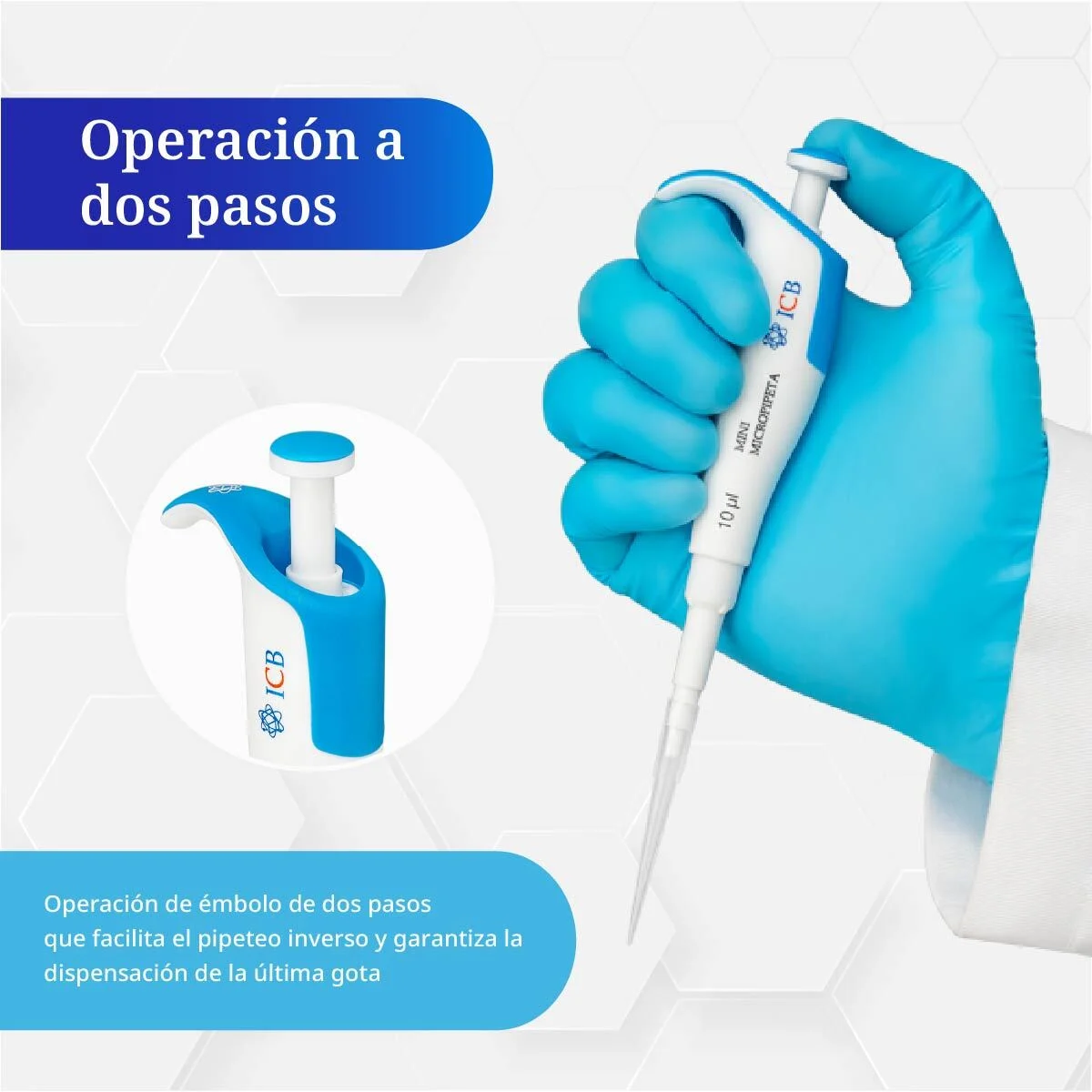 La micropipeta mini de 10 µl incorpora un mecanismo de operación en dos pasos que optimiza el manejo de líquidos con precisión y versatilidad: