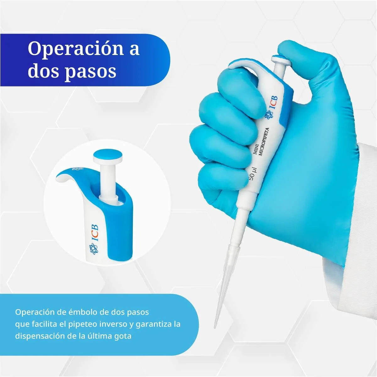 El mecanismo de doble acción en la micropipeta mini de 50 µl está diseñado para optimizar la precisión y versatilidad en la manipulación de líquidos: